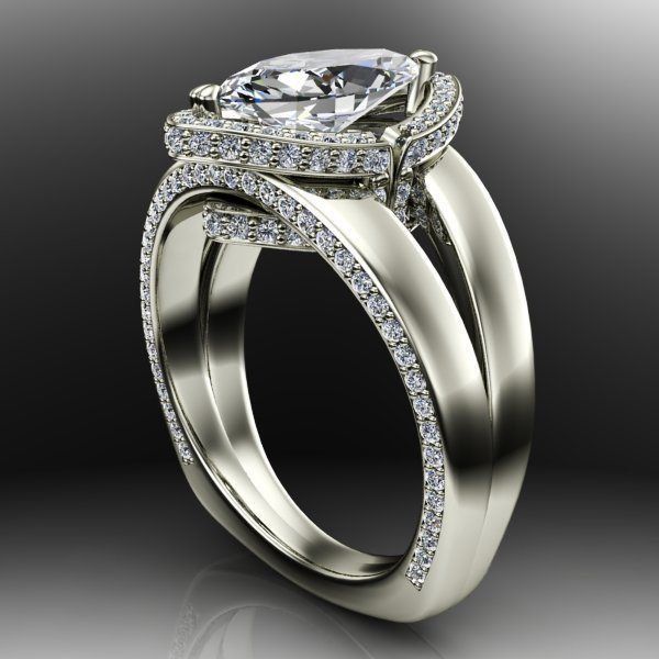 This broad split shank design accommodates a large marquise center with an upper and lower collar accented with diamonds to surround the setting. With details including a square shank for stability and diamond accents down the side of the ring, this design is both robust and eye catching.