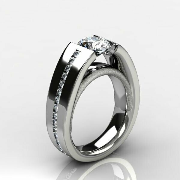 Platinum band with tension set center stone and channel set diamonds down the shank, with a textured underbridge.